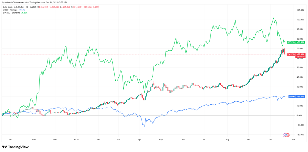 As of this week, it trades near $4,340/oz, up roughly 60% YTD. Bitcoin sits around $107,000, up about 76% YTD.