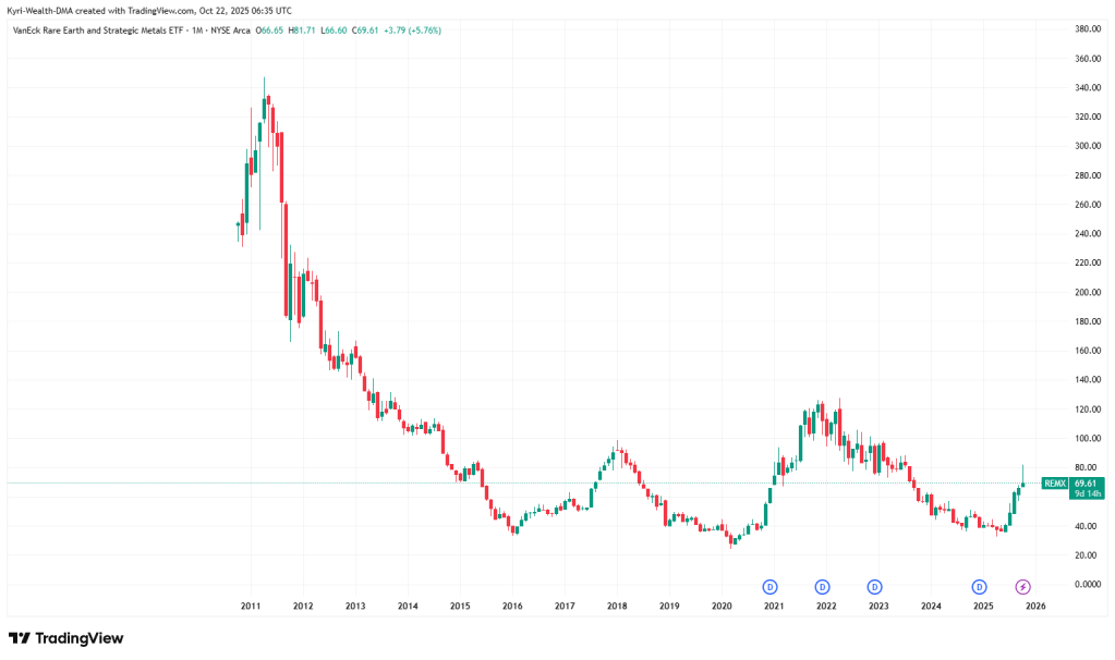 In 2021, REMX topped near $130. By early 2024, it was below $40. It’s high beta, cyclical, and moves with China headlines.