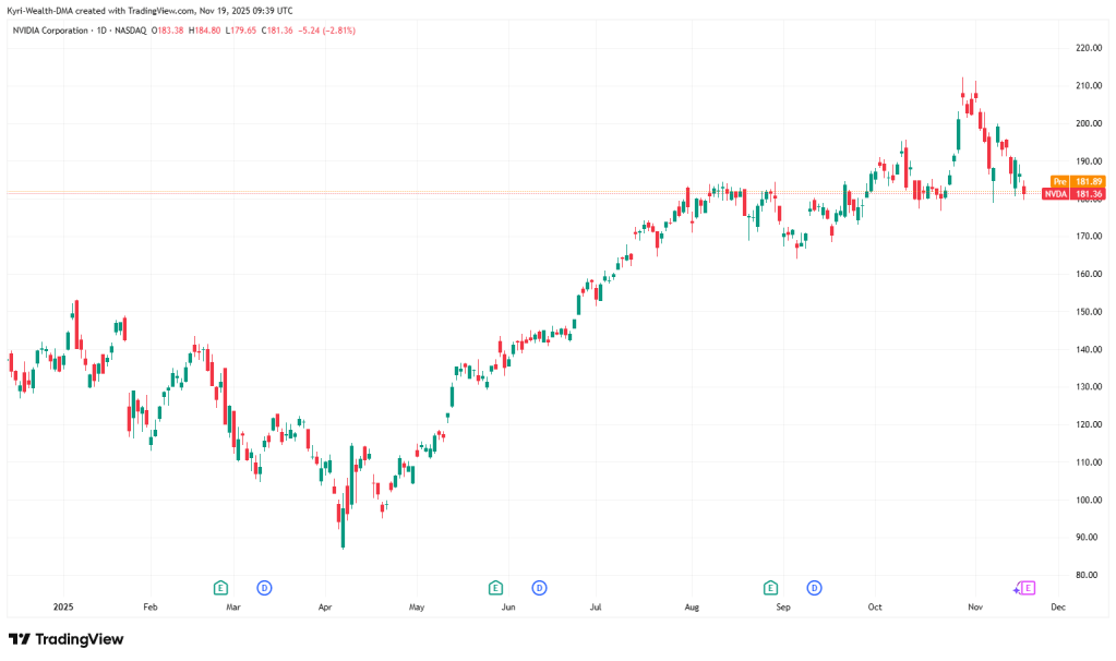 Looking at Nvidia’s chart this morning, you see a stock that has already rolled over from the October highs around $210 and is now sitting near $181 — basically the same zone it defended during August–September. It’s not a collapse, not a trend break, but a clear loss of momentum. Lower highs, buyers hesitating, sellers probing.