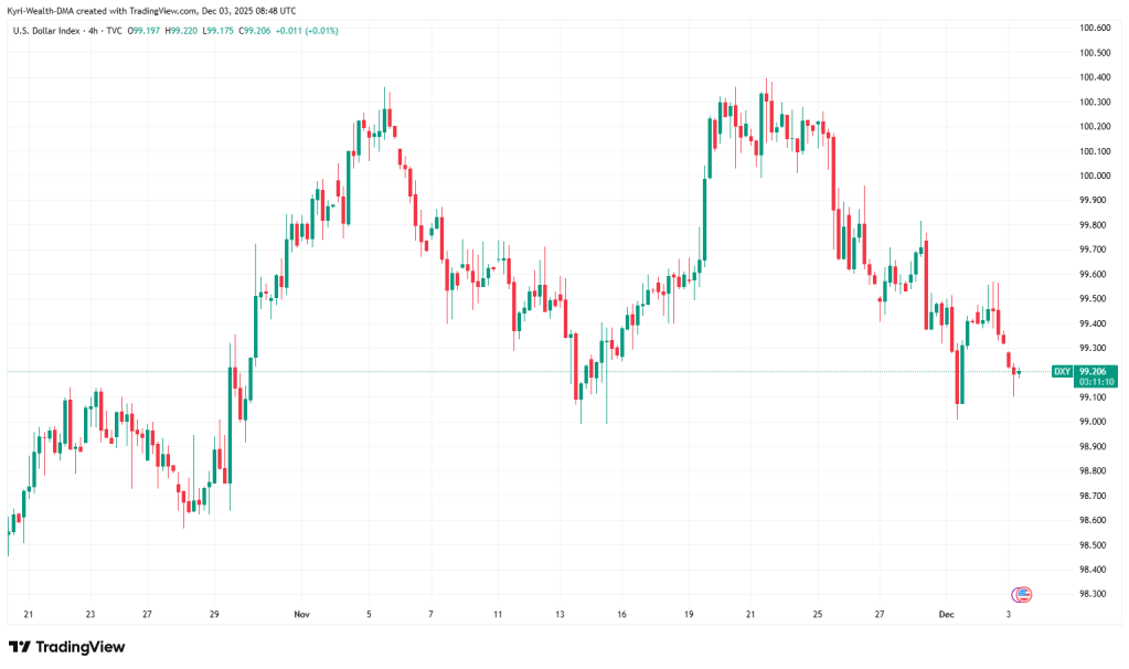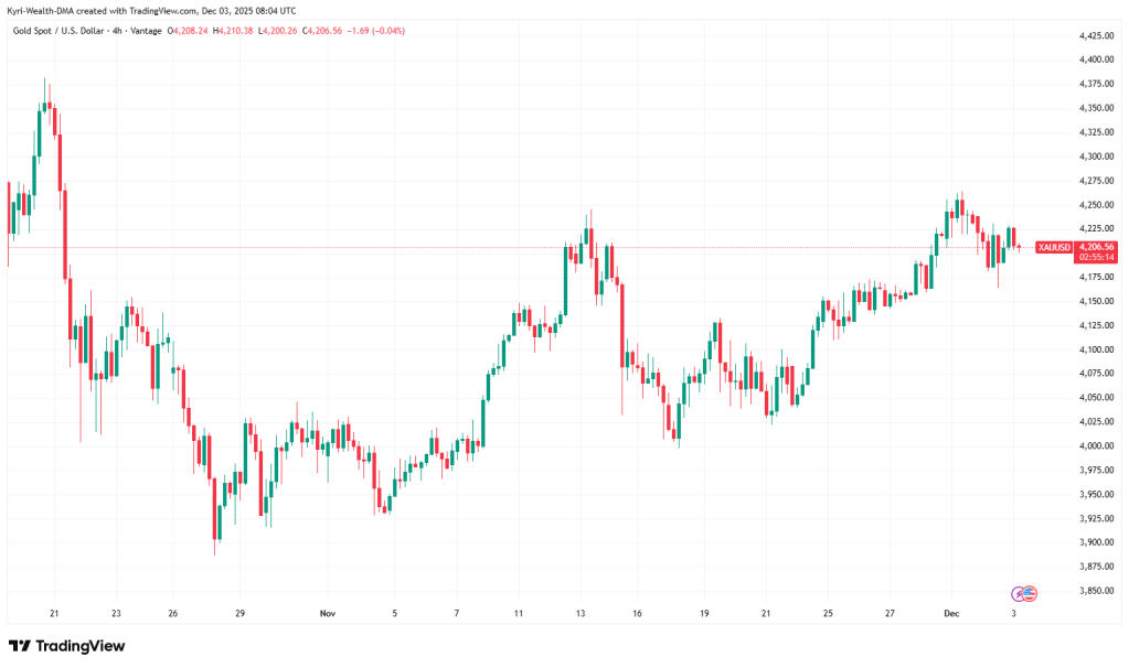 The 4-hour chart is now a slow grind higher from the early-November low near 3,900, with price chopping just under the recent 4,270 swing high. This week is about one question: is this consolidation fuel for another leg up – or the top of the current move?