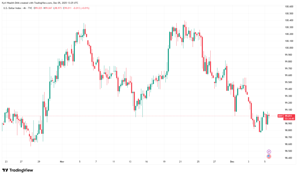 - Dollar: DXY is sitting just under 99 after slipping from the 99.5–100 area over the last two weeks – weak, but not collapsing.