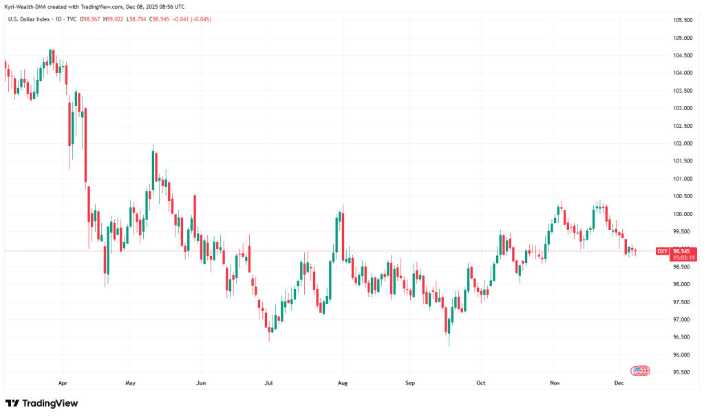 Then we’ve got the dollar, sliding away in the background. DXY has been leaking lower and now sits just under the 99 area. Not a collapse, but a controlled drip. That weaker dollar is what’s feeding both the gold strength and the tech resilience. As long as the greenback stays on the back foot, risk assets look clever and hedges feel expensive. The danger is the classic post-event snap-back: dovish expectations into the meeting, mild disappointment during the press conference, and suddenly DXY is ripping higher while everyone else is the wrong way round.