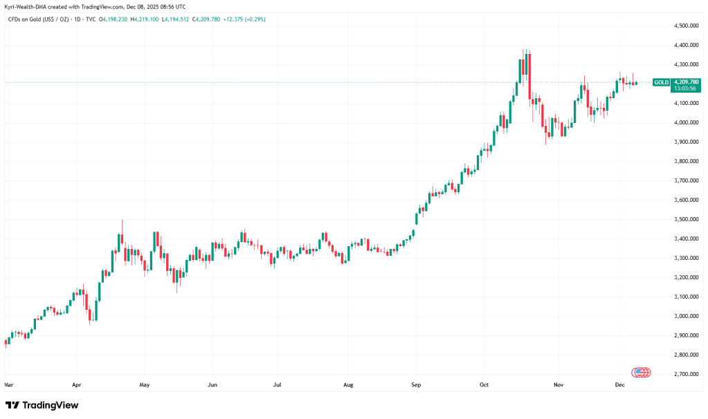 Gold sits near the top of a very clean, months-long uptrend. This is not a meme spike or a one-day wonder – it’s the result of the market quietly admitting that real yields are rolling over and that we are moving into an easing phase, whether central bankers enjoy saying it out loud or not. Every wobble has been bought, and the latest consolidation near 4,200 is just the market catching its breath.