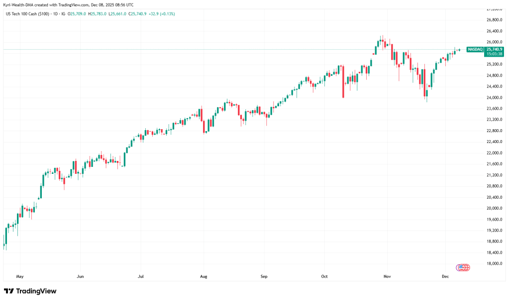 Nasdaq tells a related story but with a bit more drama. We’re not in melt-up mode; we’re in grind mode. The index keeps walking higher, shrugging off dips, living off the promise of cheaper money and “okay-ish” growth. Late-cycle optimism, basically. That’s nice until the narrative changes. One hawkish surprise from the Fed or a growth scare, and that steady staircase higher suddenly matters a lot less than the gap underneath.