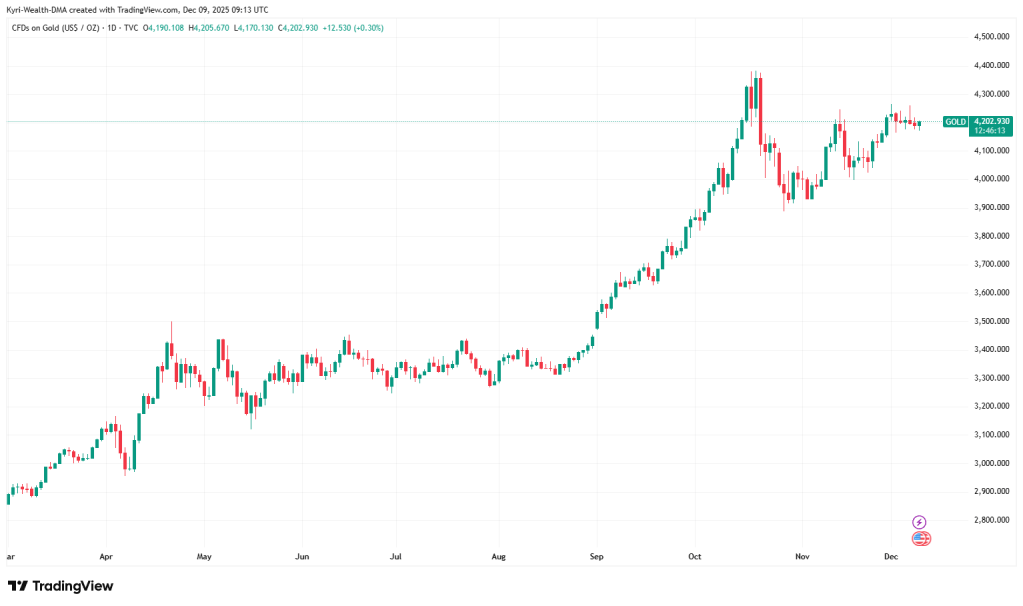 Gold dipped -0.17% to around $4,189.59 yesterday but remains close to early-December highs above $4,260 and comfortably above its August–December uptrend line near $4,075.IG+1 Prices are consolidating rather than reversing, which fits with a market that expects a cautious Fed cut rather than a full pivot.