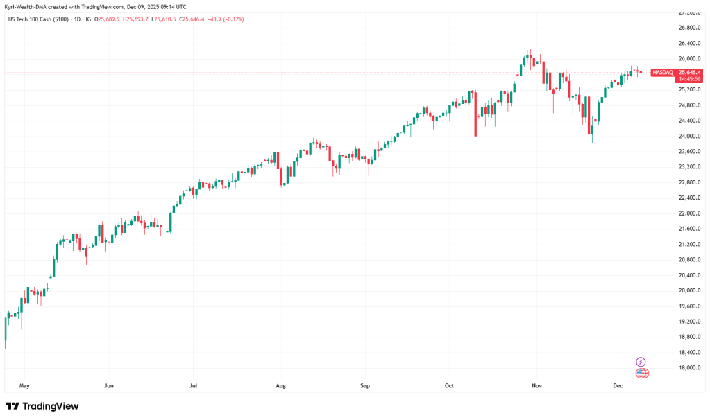 The Nasdaq 100 slipped about -0.25% yesterday after a run at the highs, with the broader Nasdaq Composite off only -0.14% as mega-cap tech stayed mixed – Microsoft and Nvidia up, Alphabet, Amazon and Tesla lower. The structure on the daily chart still looks like a grind higher with shallow pullbacks rather than a topping pattern.