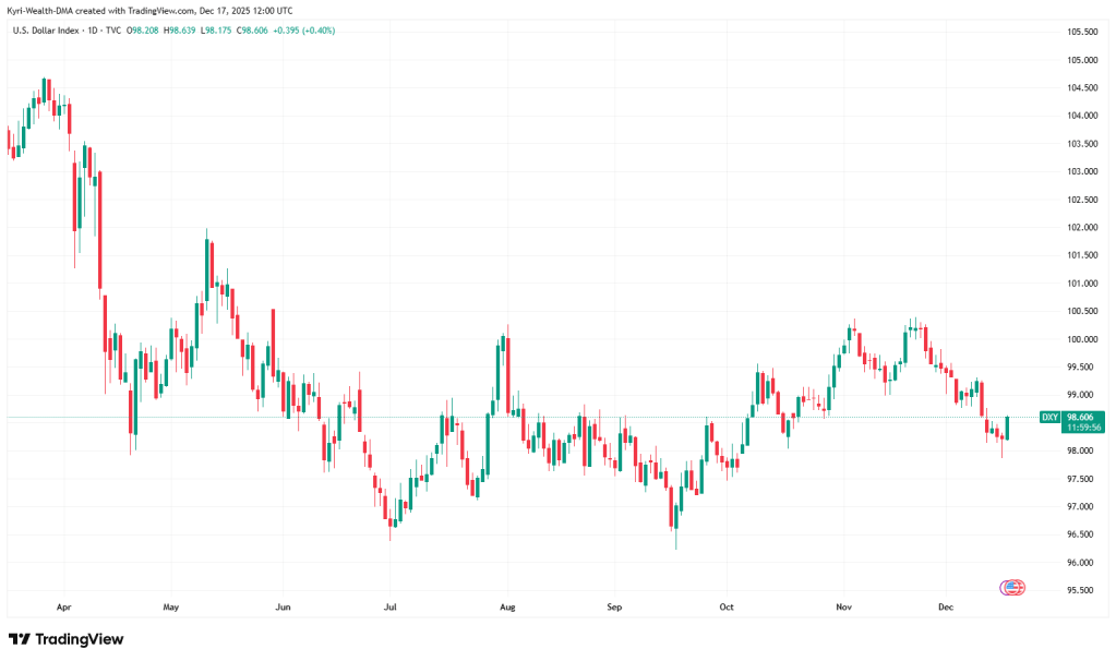 The dollar index sits near 98.5 after a poor year and a recent bounce from the 98 handle.