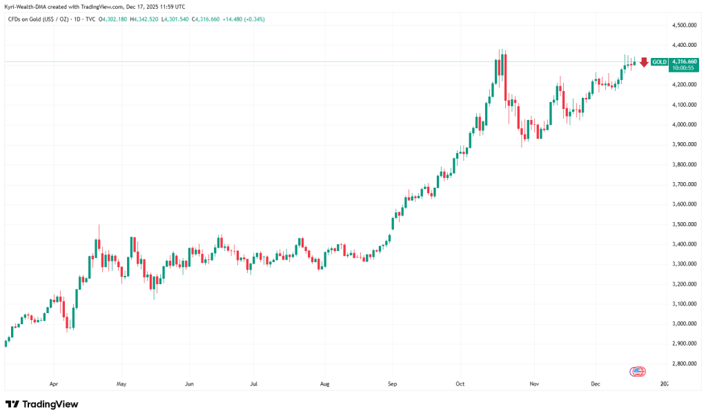 - Gold trades around $4,300 after testing the $4,340 area again. Bulls still control the longer trend.