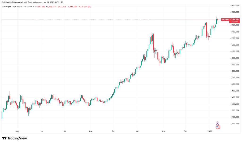 Gold has surged to fresh record territory, briefly touching above 4,620 before easing as investors booked profits.
