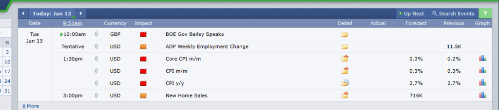 First, a ForexFactory-style calendar panel in UK time, highlighting Bailey’s speech, US CPI, and New Home Sales.
