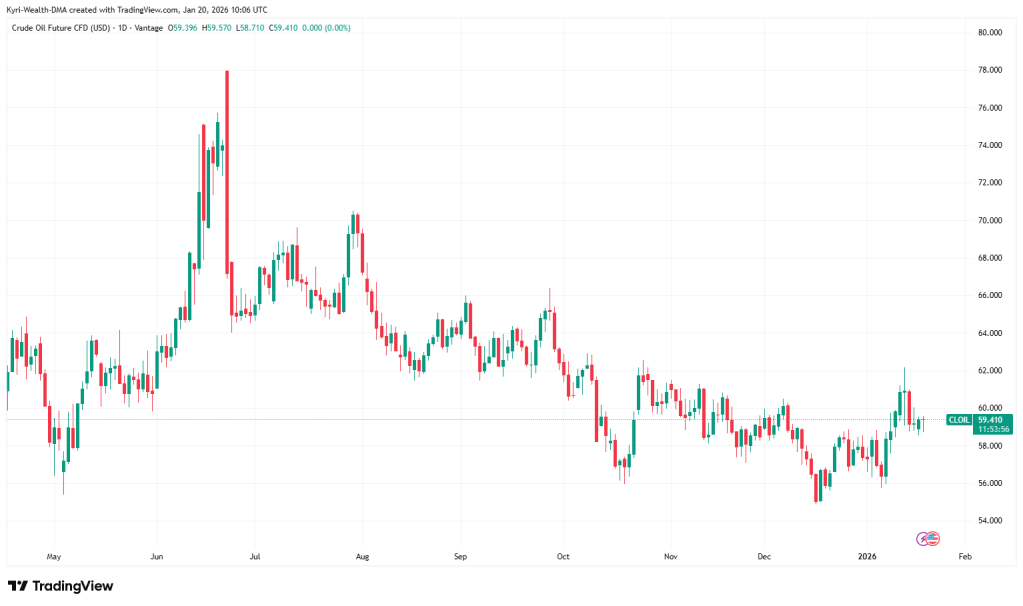 - Geopolitics Fading Premium — Iran/Venezuela/Black Sea tensions (e.g., Kazakh export disruptions) provided temporary lift, but no sustained Strait of Hormuz threat or major outage. Trump’s Greenland/EU focus shifts risk narrative away from energy chokepoints.