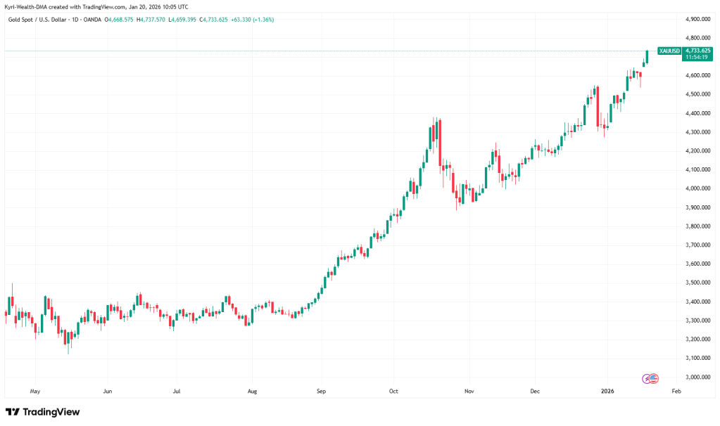 - Trade & Tariff Escalation — Trump’s weekend announcement of 10% tariffs on eight EU nations (Denmark, Norway, Sweden, France, Germany, Netherlands, Finland, UK) effective Feb 1 (potentially 25% by June unless Greenland deal) has reignited fragmentation fears. Europe preps retaliatory levies on €93bn US goods; Davos now feels like a risk event. Gold thrives when policy predictability erodes.